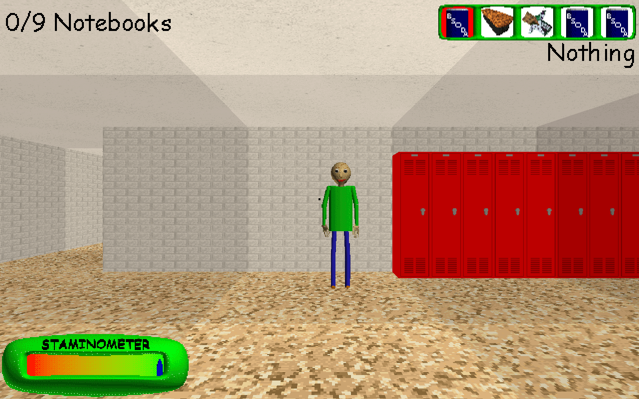 So, what exactly do you do in this game? You collect notebooks while playing hide and seek with Baldi! Sounds easy right? Wrong. Baldi can hear many of your actions, and he uses those sounds to try and find you. He's also invited many friends to come and play, who can cause a lot of trouble. Get to know them though and you can use them to your advantage! You'll also find lots of items scattered around the school. These are the key to success. Use them wisely if you want to have a chance at beating Baldi!